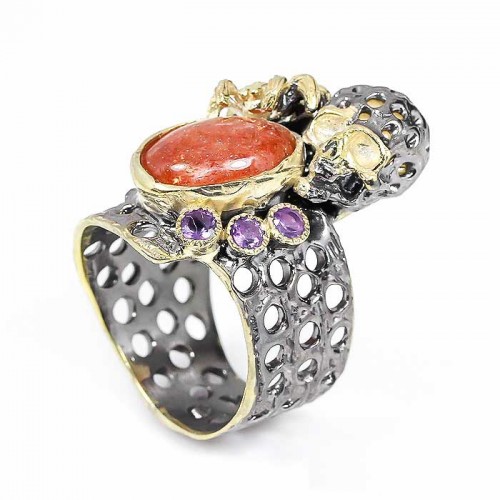 טבעת בשיבוץ סנסטון ואמטיסט עבודת יד כסף ציפוי זהב ורודיום שחור